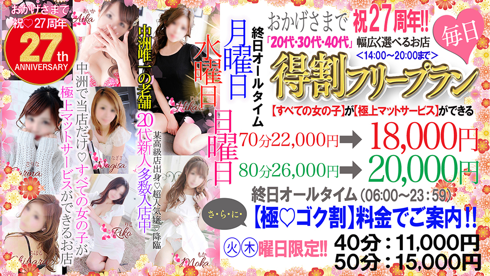 【祝27周年】(20代・30代・40代)幅広く選べるお店♡中洲唯一(すべてのキャスト)が極上マットサービスをご提供!!